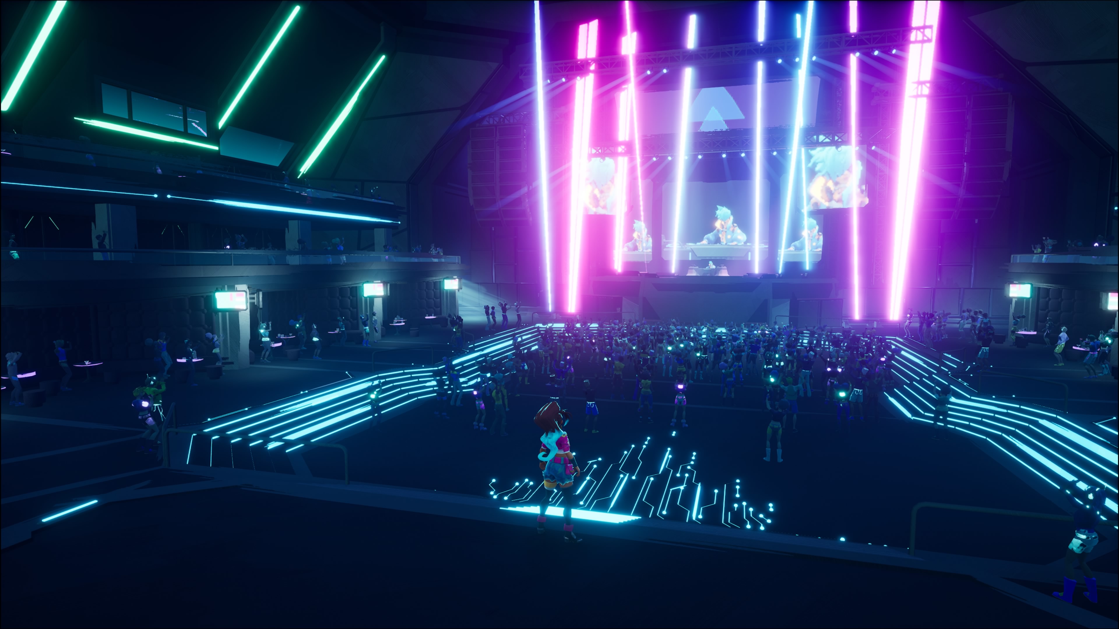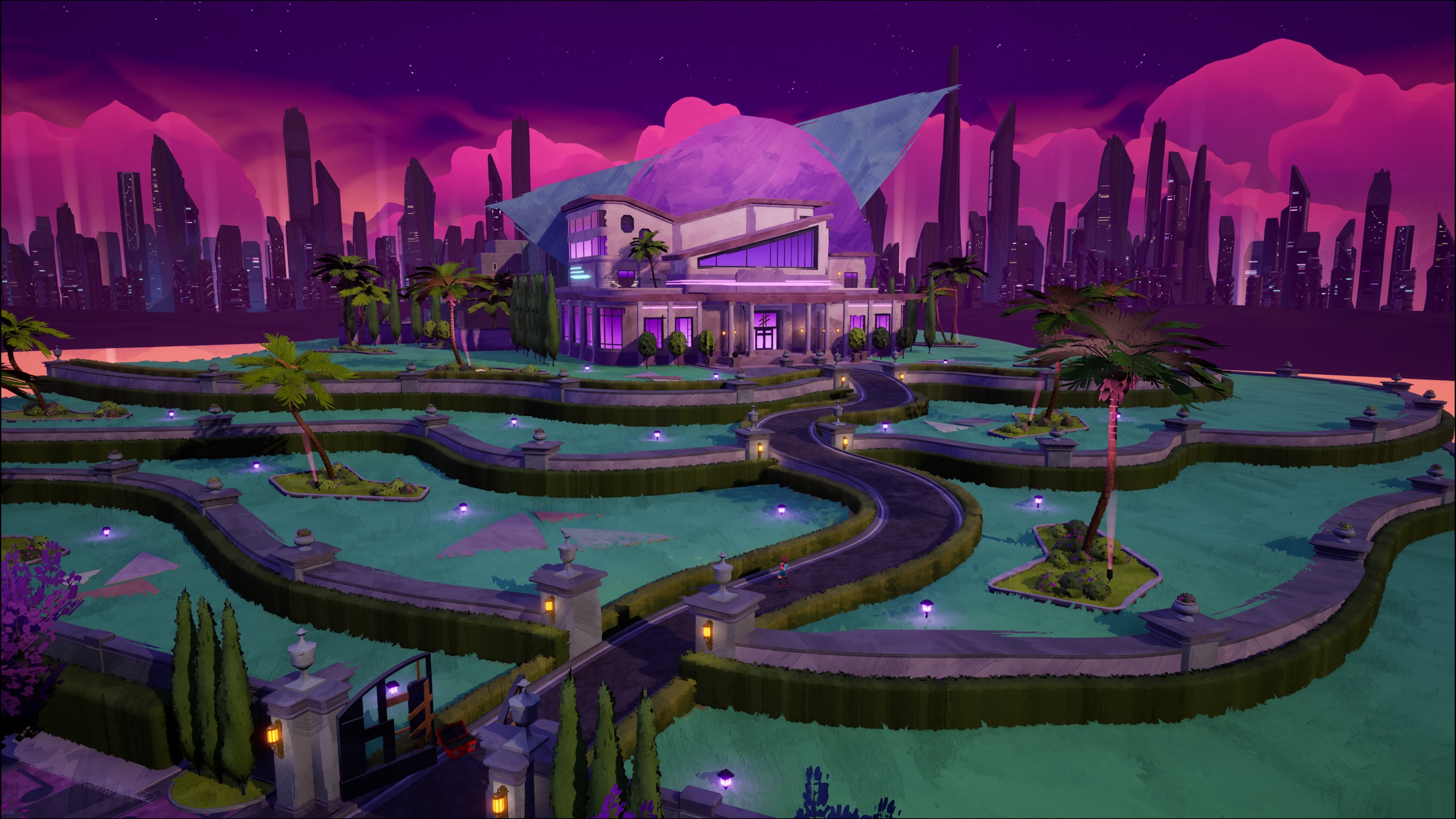 Each region is fiercely devoted to their genre in all facets and expresses this through unique soundtracks and architecture. The EDM themed city of Lumina is a rain-soaked, neon-lit cyberpunk metropolis, plagued by a rave drug epidemic. The classically themed Archaia is an elitist castle city whose enormous walls physically and metaphorically reject the approach of modernity and protect tradition fiercely. Each of the eight explorable regions follows this pattern offering consistently appealing visual and auditory diversity with some mild social commentary.