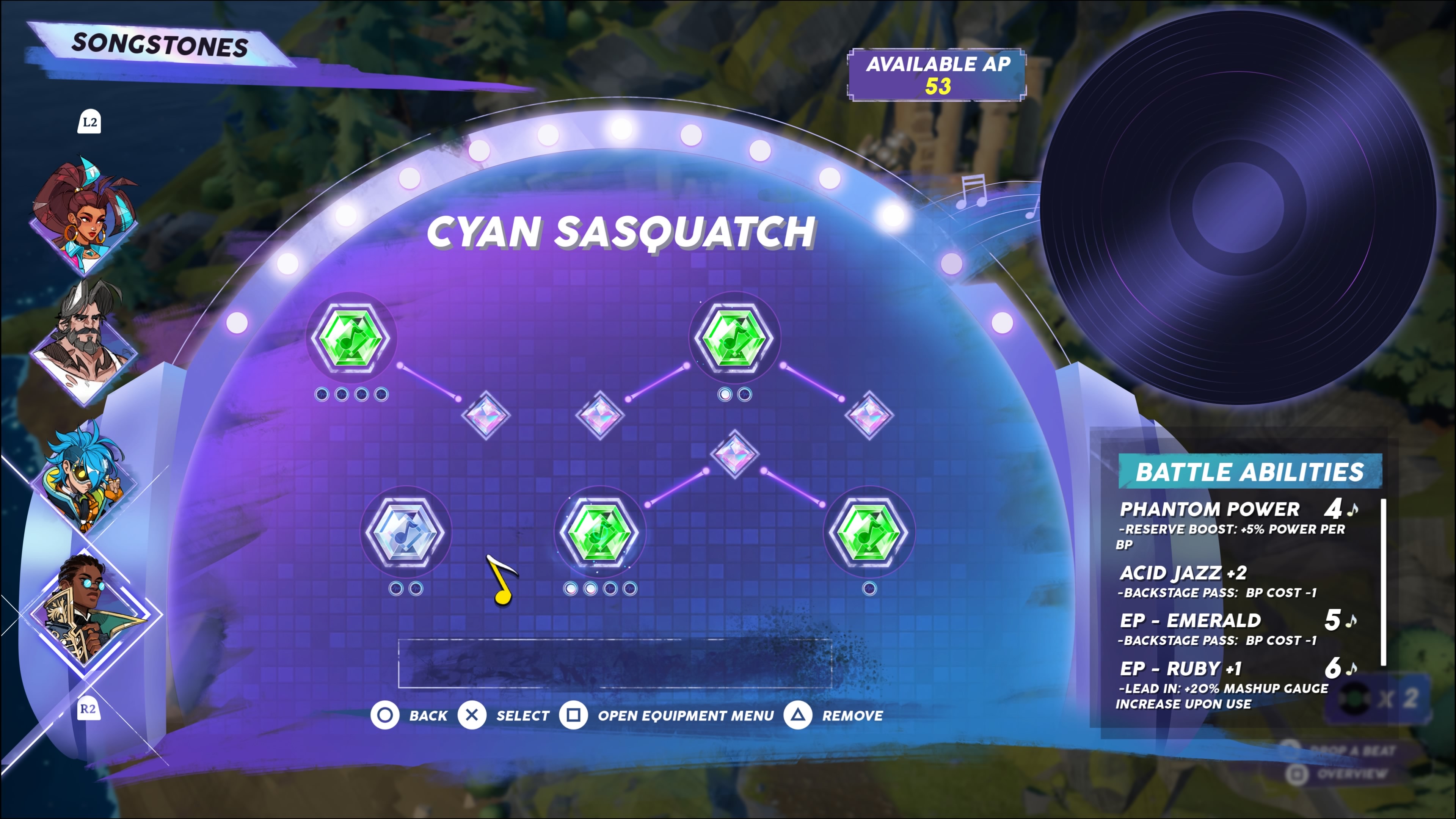 *Tip: This is an example of an instrument and the Songstones attached to it. The diamond shaped crystals modify the hexagonal crystals with a small perk. The backstage pass perk lowers the cost of an action by 1 and is exceptionally strong. Stock up on these when you encounter them in Durandia and attach them to most perks.